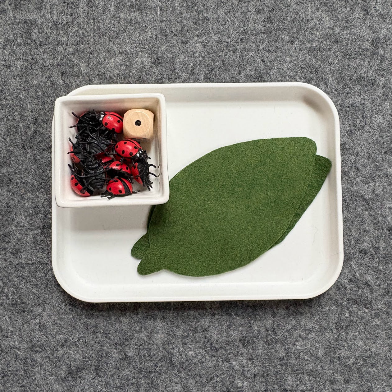 Comes with tray, dish, 12 ladybugs, 1 wooden die, 2 felt leaves.